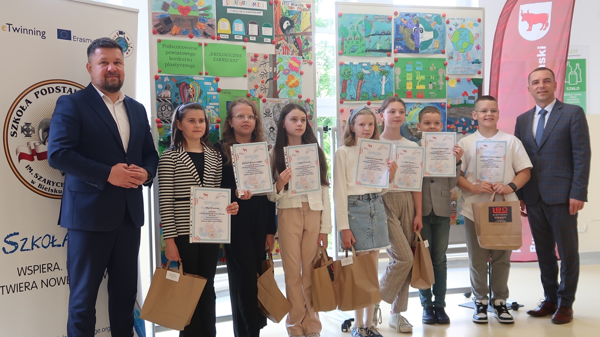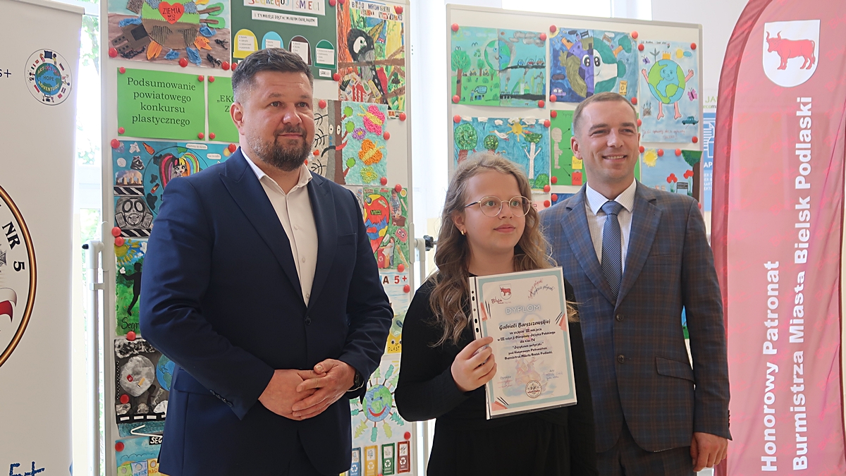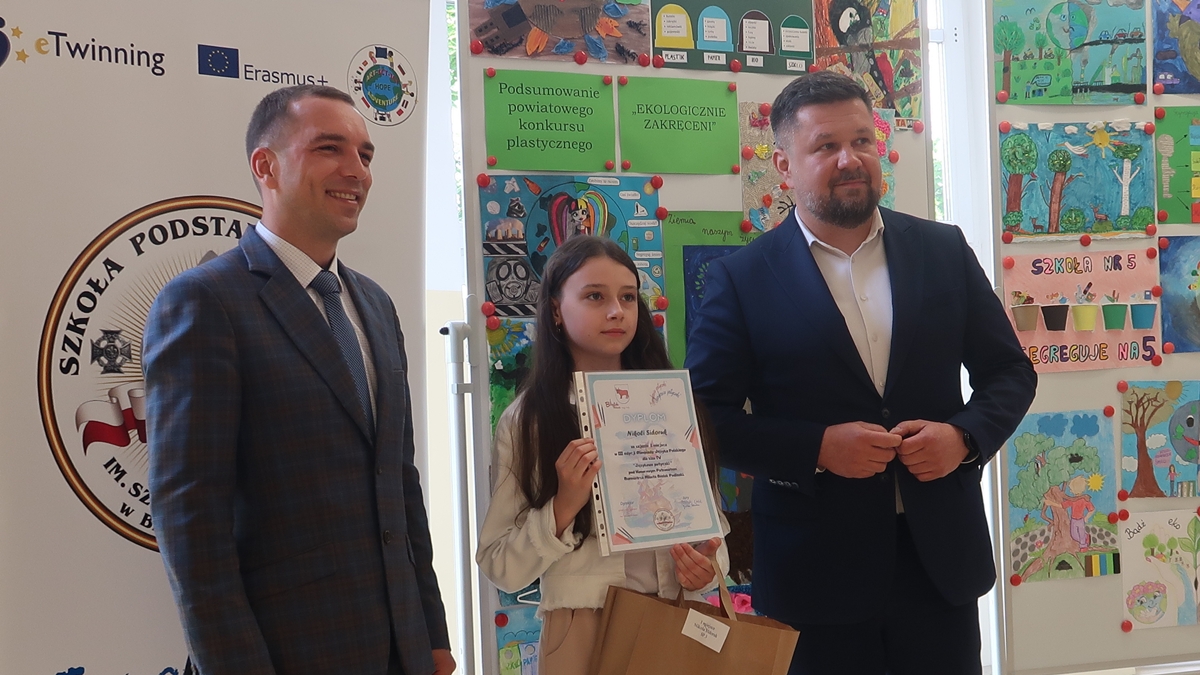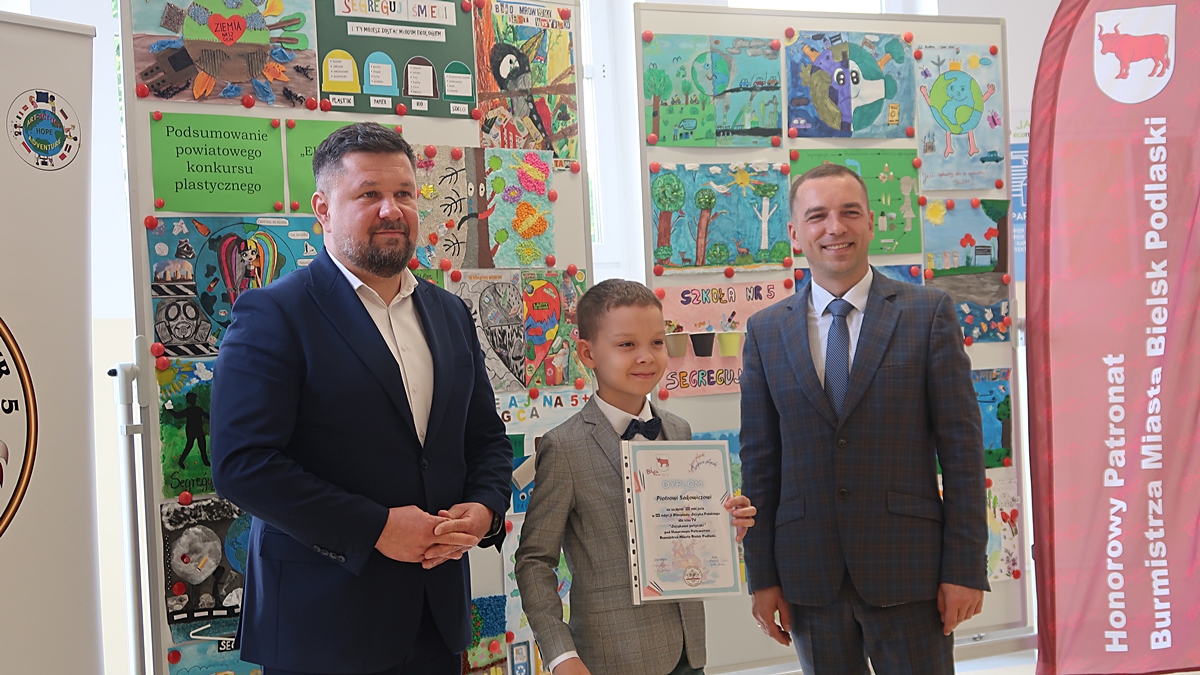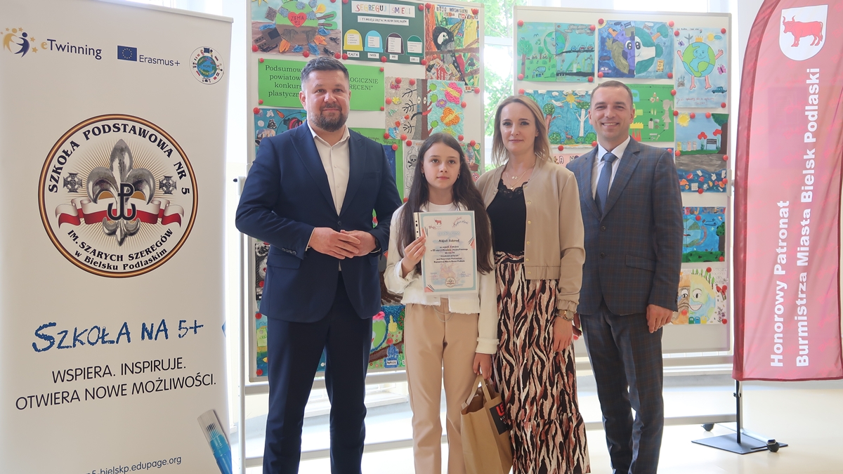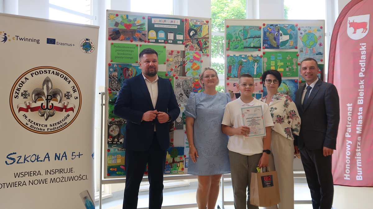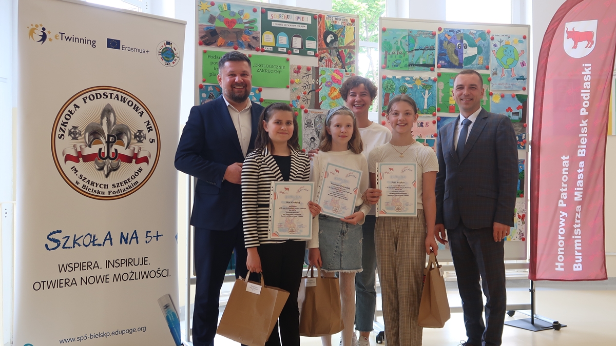 Nagrody rzeczowe wręczyli laureatom: Burmistrz Miasta Bielsk Podlaski Piotr Wawulski oraz Dyrektor Szkoły Podstawowej nr 5 im. Szarych Szeregów Mateusz Sadowski.