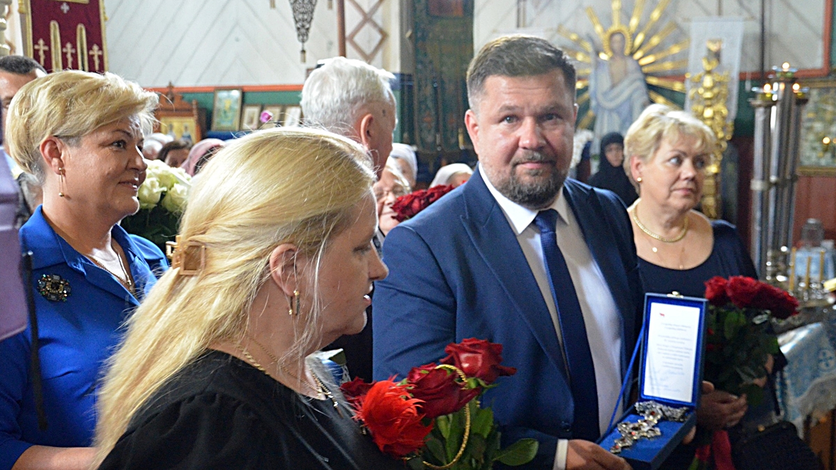 Nie zabrakło również przedstawicieli władz samorządowych. W imieniu Miasta Bielsk Podlaski obecni byli Burmistrz Piotr Wawulski oraz Zastępca Burmistrza Iwona Kołos, którzy przekazali czcigodnemu jubilatowi szczególny dar – krzyż z wizerunkiem Chrystusa Dobrego Pasterza, jako wyraz wdzięczności i szacunku całej społeczności miasta.