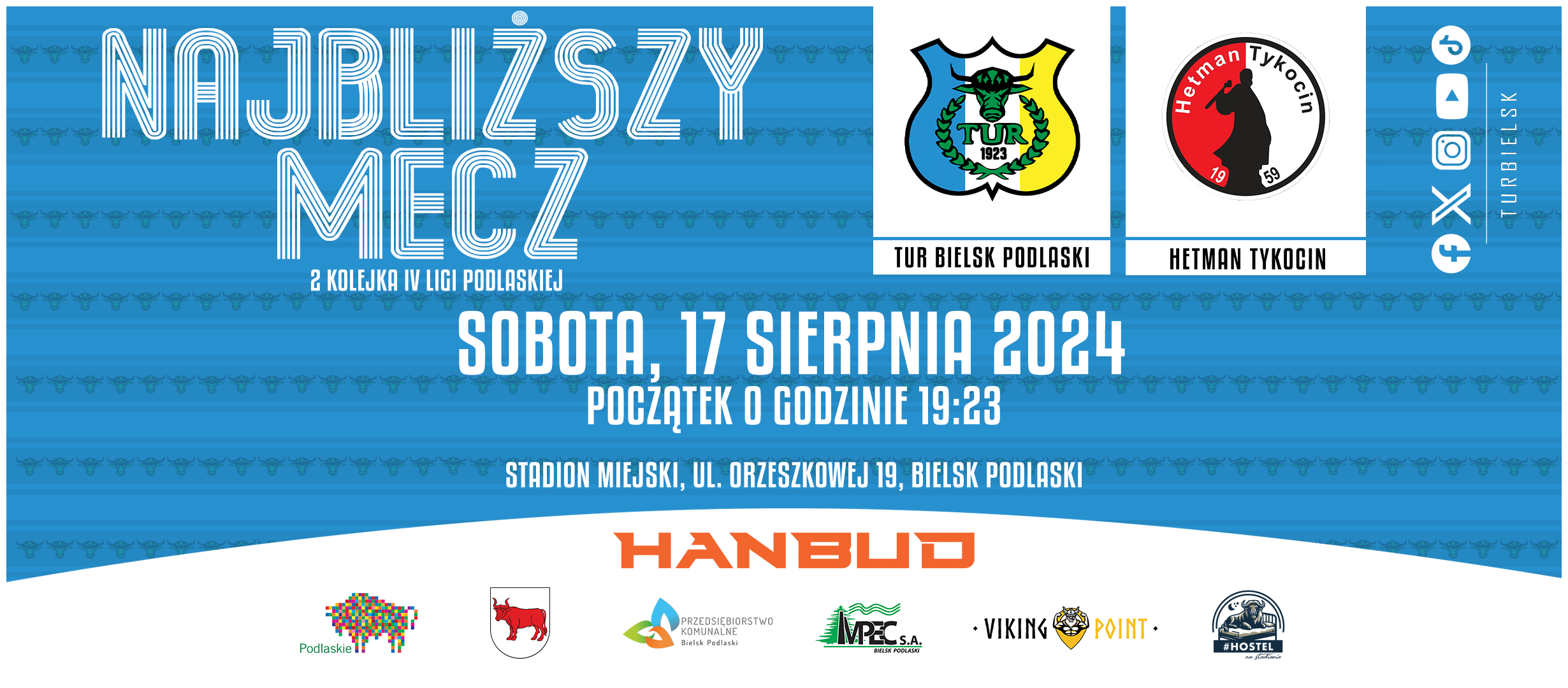 Ceremonia otwarcia nowego boiska planowana jest na godzinę 19:00 w sobotę 17 sierpnia 2024 roku. Tuż po niej, o godzinie 19:23, rozpocznie się mecz podlaskiej IV ligi piłki nożnej pomiędzy Turem Bielsk Podlaski i Hetmanem Tykocin. Czas rozpoczęcia meczu nawiązuje do roku powstania bielskiego klubu i jego bogatej, ponadstuletniej przeszłości. Wszystko to odbędzie się na obiektach MOSiR-u przy ul. Elizy Orzeszkowej 19 w Bielsku Podlaskim.
